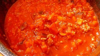 大きく切った茄子を多めのオリーブオイルで揚げ炒めして、唐辛子を効かせたピリ辛トマトソース。