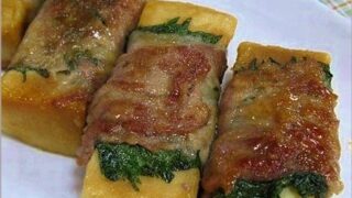 高野豆腐の中に梅肉を詰めて、豚肉と青じそで巻いてみました。