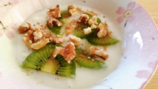 オメガ3脂肪酸が豊富なくるみと、ビタミンCやビタミンEがたっぷりのキウイをヨーグルトにトッピングしました♪