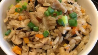 沖縄の旧盆初日、ウンケー用のジューシーです。豚バラ肉ブロック(三枚肉)から出汁を取ると、とても美味しくなります。