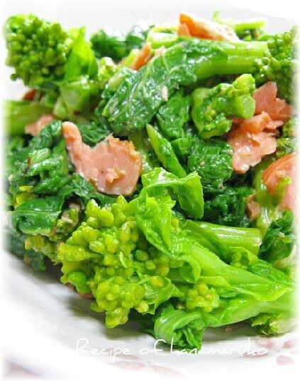 春の誘い菜の花と、鮭のほぐし身を胡麻ドレッシングで和えてみました。 ひと足早い春の訪れを感じさせてくれる一品かもです。
