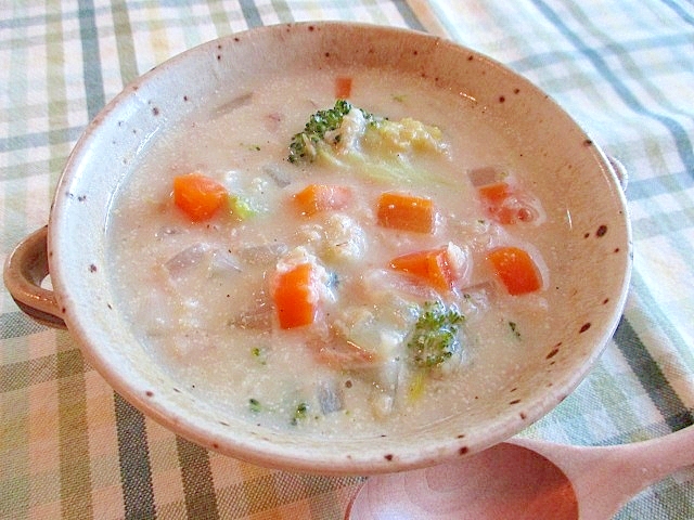オートミールとツナと野菜のとろとろ豆乳スープ♪ 汁物・スープ Twitter Facebook はてブ Pocket LINE コピー 2023.09.02 オートミールを煮込んでとろみの付いた、食べる具だくさんスープです♪ひと皿で栄養バランスもバッチリ! レシピはこちら (楽天レシピ) 約15分 300円前後 目次 材料みんなのレビュー 材料 オートミールブロッコリーにんじん玉ねぎツナ缶(水煮)水豆乳顆粒コンソメ塩コショー みんなのレビュー